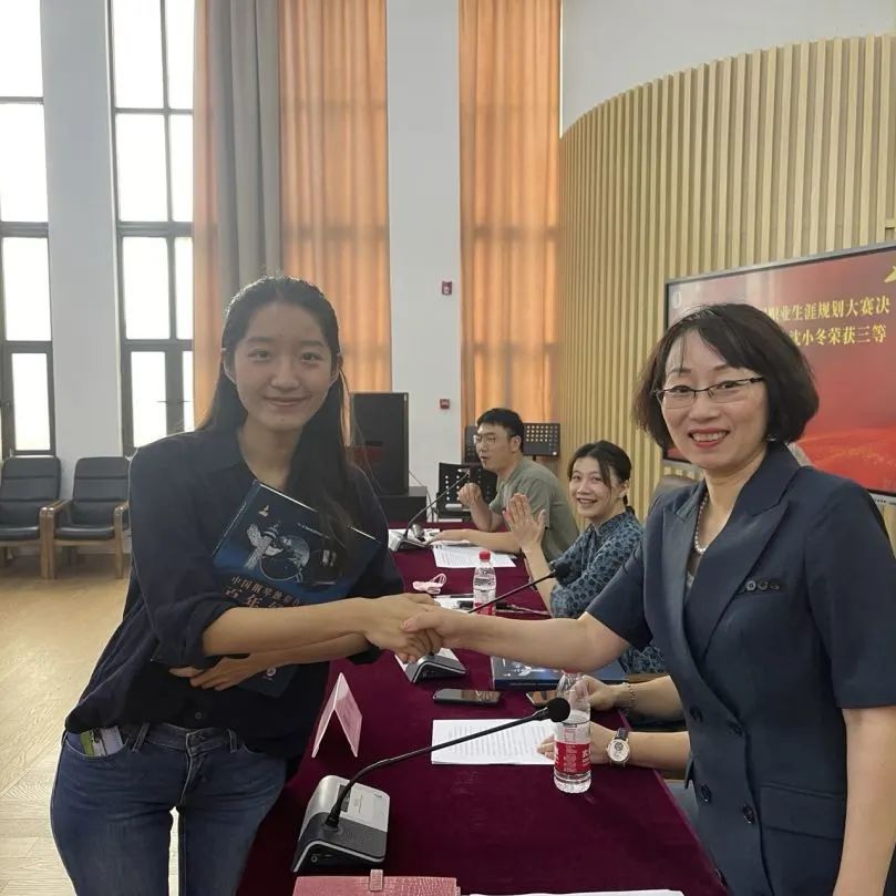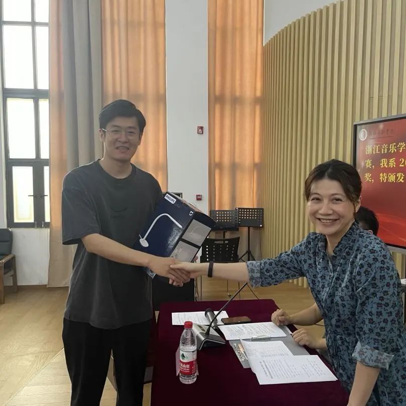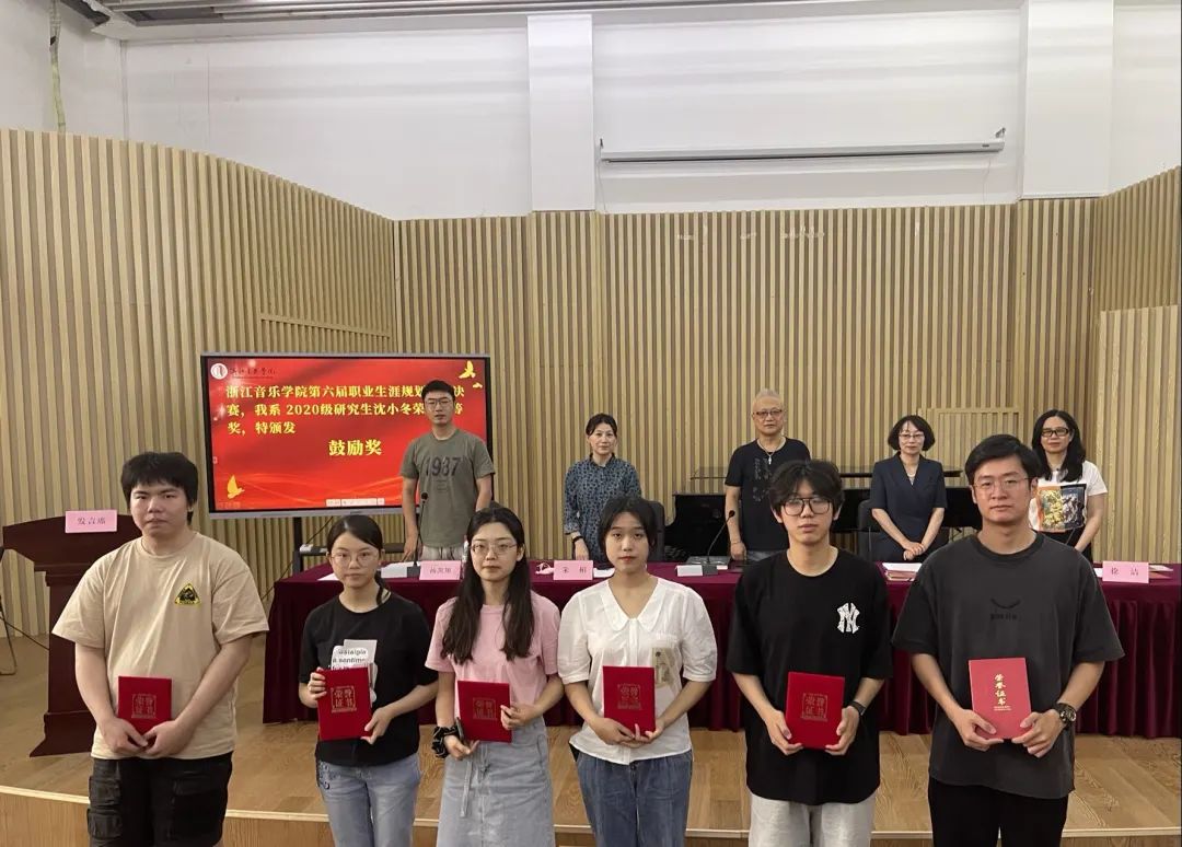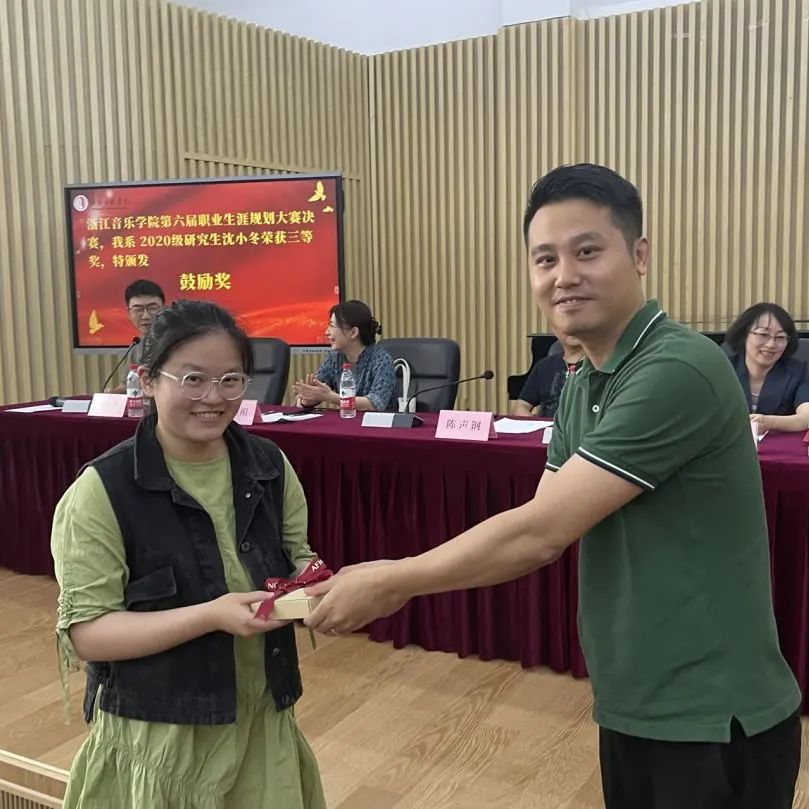 浙江音乐学院规划大赛获奖学生沈小冬和省大学生体测成绩突出学生王香婷上台领奖。