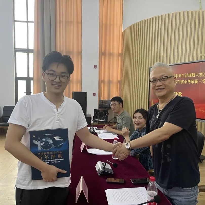 国际钢琴专业比赛获奖优秀学生明亮、王语晨上台领奖。