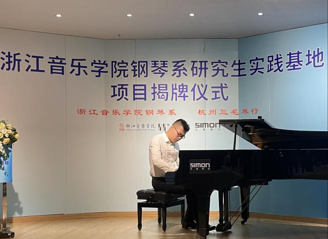 随后,浙音钢琴系和杭州三毛琴行双方领导签订合作协议,并共同为浙江音乐学院钢琴系研究生校外实践基地项目揭牌。浙音钢琴系研究生代表郭春晖演奏了中国经典钢琴作品——《彩云追月》,揭牌仪式在美妙的音乐声中圆满结束。