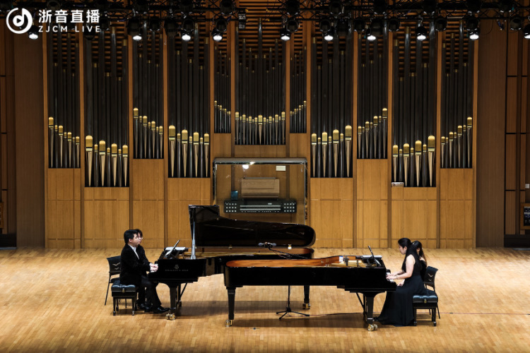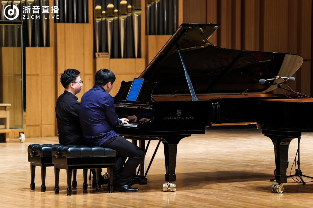 朱昊老师和陈小雨老师四手联弹世界首演的《之江新声》,一呼一应的演奏如同渔舟唱晚般,宁静清澈又美丽自然;乐曲发展到中段,节奏变得紧凑,欢快而充满活力,如同浙江人勇立潮头的改革精神。