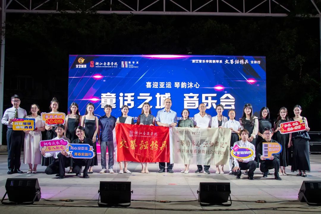 在全省上下深入开展习近平新时代中国特色社会主义思想主题教育、高质量发展建设共同富裕省域样板之际,我系师生组成“文艺轻骑兵”在云和中山广场上举办“喜迎亚运 琴韵沐心”童话之城音乐会。校党委副书记王均寅、钢琴系党总支书记崔洁、院校团委副书记徐晓昀、云和县委常委宣传部部长梅华、云和县委宣传部常务副部长杨恒斌、云和县文化和广电旅游体育局副局长胡国生、钢琴系青年教师龚璇出席了此次活动。