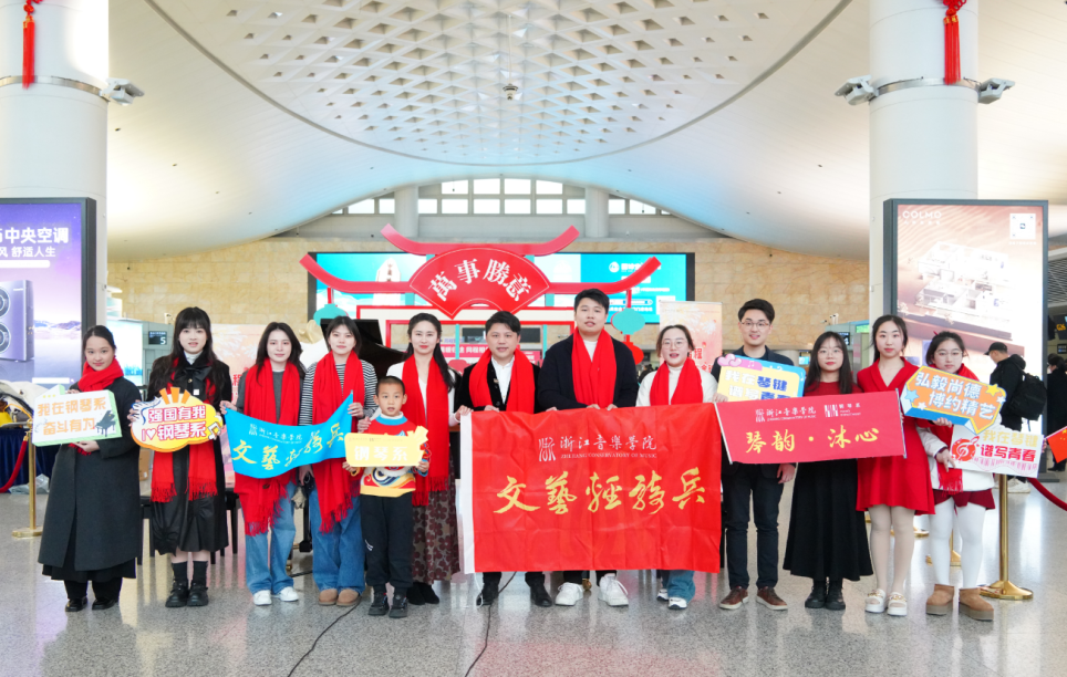 近年来浙江音乐学院以“文艺赋美”工程为牵引,充分发挥学科专业和人才、艺术资源优势,常态化组织师生以“文艺轻骑兵”小分队的形式,开展形式多样、内容丰富的“文艺下基层”活动,促进高雅艺术普及,丰富群众文化生活,在助力文化强省和共同富裕示范区建设中发挥了积极作用。作为浙江音乐学院“文艺轻骑兵”的系列活动之一,我们依托系部“琴韵·沐心”党建品牌,开展了此次快闪活动,希望能够为社会注入更多的正能量和文化魅力,为春运期间的旅客们带来一份美好的祝福。”