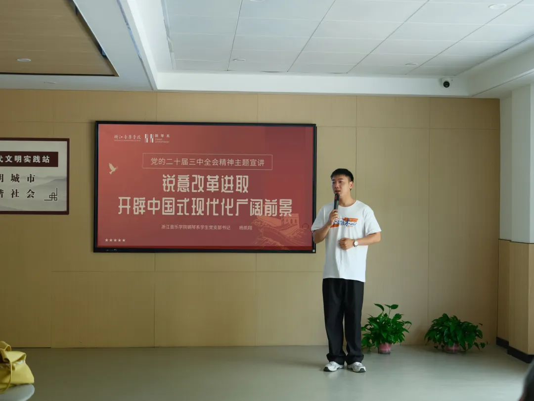 为深入学习贯彻党的二十届三中全会精神,实践团带队教师、钢琴系学生党支部书记杨凯翔在泰顺峰门新村一老一小服务中心,组织开展“锐意改革进取,开辟中国式现代化广阔前景”党的二十届三中全会精神主题宣讲。将会议的核心要义和丰富内涵传递给基层群众,帮助他们更好地理解全会精神,坚定信心,凝聚力量,为实现中华民族伟大复兴的中国梦贡献力量。