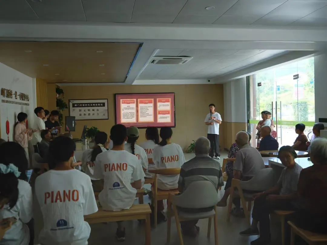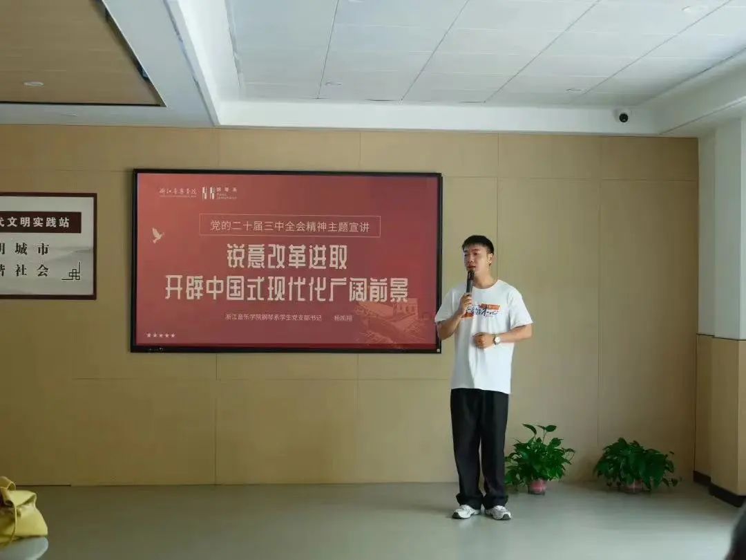 为深入学习贯彻党的二十届三中全会精神,在本次暑期社会实践活动中实践团带队教师、钢琴系学生党支部书记杨凯翔在泰顺峰门新村一老一小服务中心,组织开展“锐意改革进取,开辟中国式现代化广阔前景”党的二十届三中全会精神主题宣讲。将会议的核心要义和丰富内涵传递给基层群众,帮助他们更好地理解全会精神,坚定信心,凝聚力量,为实现中华民族伟大复兴的中国梦贡献力量。