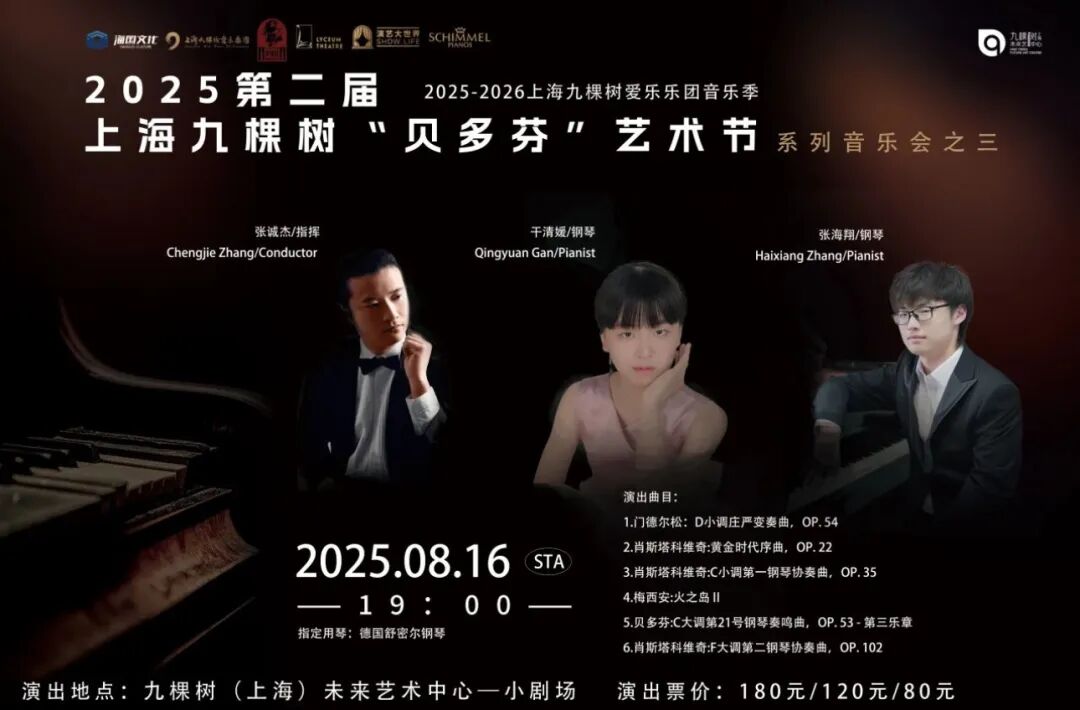 发布时间:2025-08-22近日,第二届上海九棵树 “贝多芬” 艺术节系列音乐会第三场在九棵树(上海)未来艺术中心小剧场奏响。我校钢琴大教研室优秀学生干清媛、张海翔受邀参与演出,与青年指挥家张诚杰执棒的九棵树爱乐乐团默契配合,为现场观众呈现了一场高水准的古典音乐盛宴。乐团以演绎苏联作曲家肖斯塔科维奇的经典作品为核心,纪念其逝世50周年,并呼应世界反法西斯战争胜利80周年,传递铭记历史、珍视和平的主题。