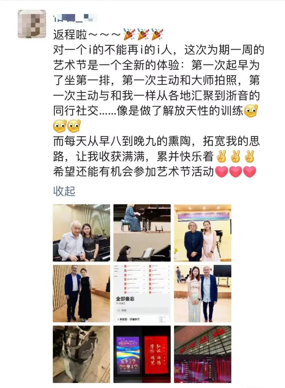 本届艺术节收获了众多学员们的反馈信息,内容涵盖大师课、音乐会、专题讲座等核心环节,整体评价积极且充满细节,字里行间能感受到大家的收获与认可。