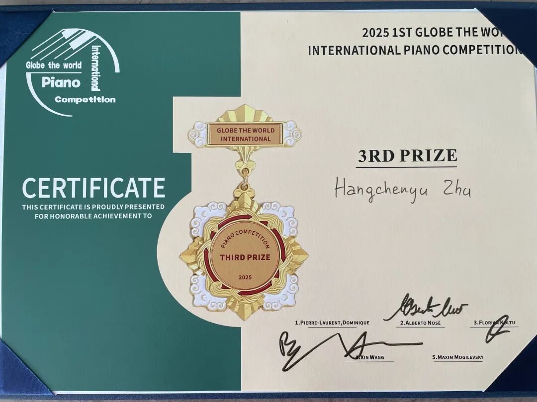 在首届环球国际钢琴比赛中,我系学生朱航晨宇获得第三名(指导老师:吴晓)