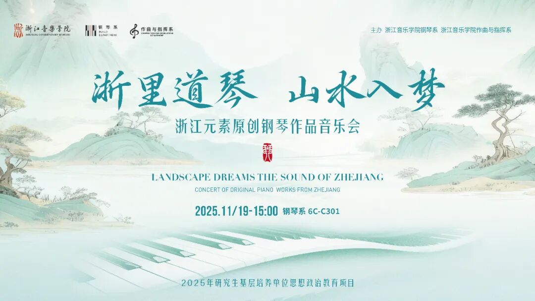 发布时间:2025-11-282025年11月19日,由浙江音乐学院钢琴系、作曲与指挥系联袂呈现的“山水入梦 浙里道琴——浙江元素原创钢琴作品音乐会”已圆满落下帷幕。本次 2025年研究生基层培养单位思想政治教育项目是一场教学成果的精彩展示,更是一次作曲与演奏艺术相互融合的完美实践,为所有到场观众留下了一个充满诗意与遐想的音乐时刻。