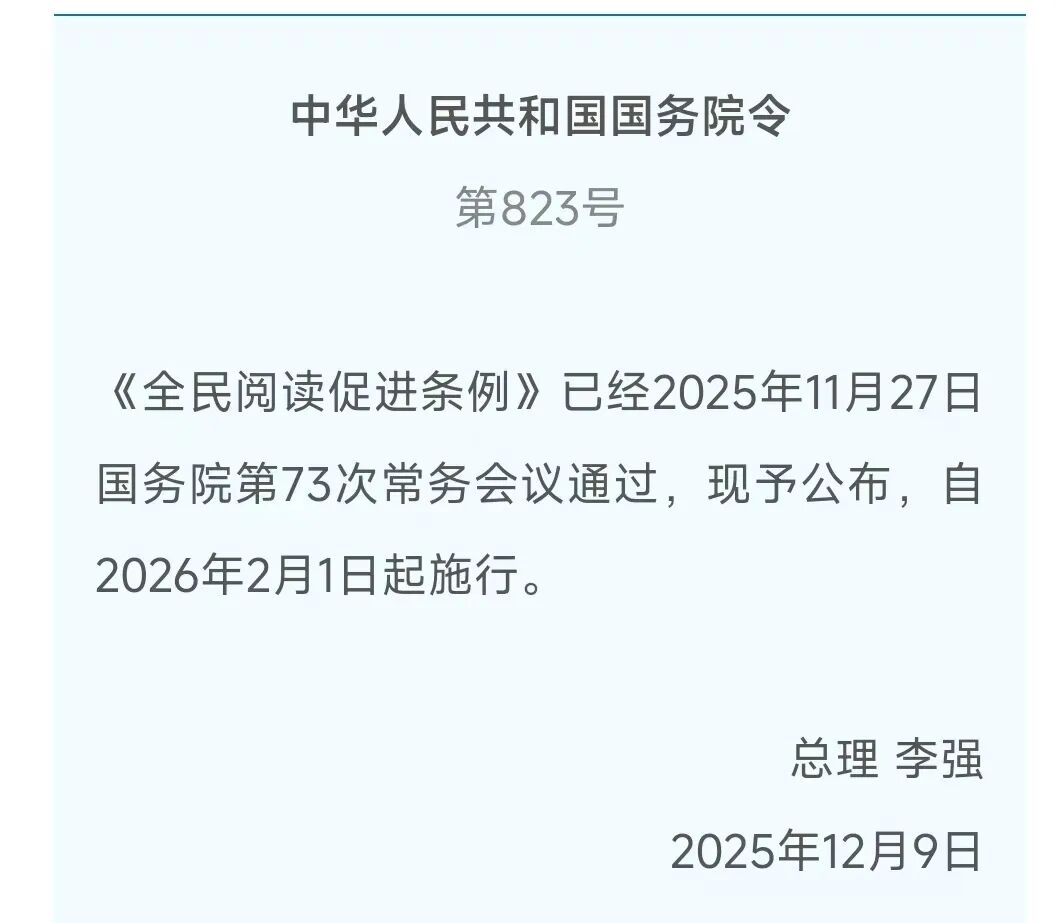 12月9日,李强总理签署了中华人民共和国国务院令,发布《全民阅读促进条例》,旨在促进全民阅读,推进书香社会建设,增强全民族思想道德素质和科学文化素养,提高全社会文明程度,推动建设社会主义文化强国。让书香浸润生活、让阅读赋能成长成为时代风尚。