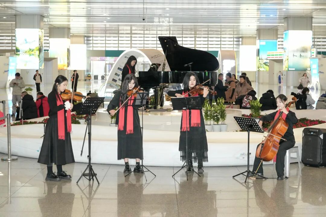 演出在《保卫黄河》的激昂旋律中拉开序幕,钢琴系学生唐子然与毛非池的四手联弹铿锵有力,钢琴的厚重音色与明快节奏交织碰撞,瞬间点燃现场热烈气氛。紧接着,管弦系带来的弦乐四重奏《拉德斯基进行曲》奏响明快的新年节拍,欢快的旋律流淌在候车大厅的每一个角落,让喜庆氛围四处洋溢;许悦携手弦乐四重奏演绎的《梁祝》婉转缠绵,经典旋律跨越岁月长河,将东方独有的浪漫与深情娓娓道来;毛非池与单簧管合作的《单簧管波尔卡》灵动俏皮,乐器间的默契配合引得现场掌声阵阵、喝彩连连。