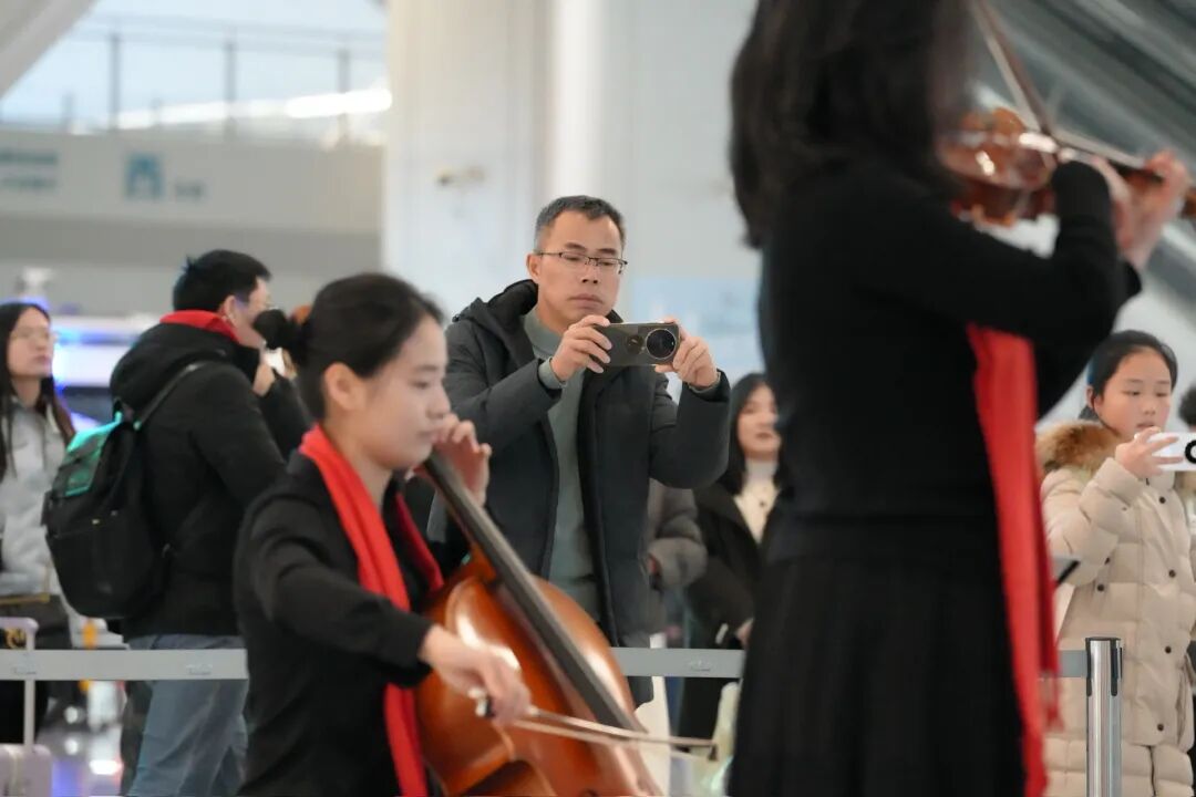 独奏曲目同样精彩纷呈,尽显艺术魅力。陈舜孜指尖流淌的《彩云追月》意境悠远,声声琴音勾勒出江南夜色的朦胧唯美;李楷伊演绎的《茉莉花》清新雅致,熟悉的旋律唤起全场共鸣,余韵悠长。当《歌唱祖国》的激昂曲调响起,陈舜孜与弦乐四重奏的完美融合,将炽热的家国情怀融入每一个跳动的音符;杨恩铭和弦乐四重奏共同演绎的《我和我的祖国》,以及于子泰和弦乐四重奏演绎的《我爱你中国》,更是以满腔爱国热情点燃整个大厅。在旅客们热烈的掌声和欢呼声中,《我和我的祖国》的旋律再次响起,现场群众自发加入合唱,激昂的琴声与嘹亮的歌声交织共振,汇聚成一片炽热的爱国热潮,演出也在万众同心的动人旋律中圆满落幕。