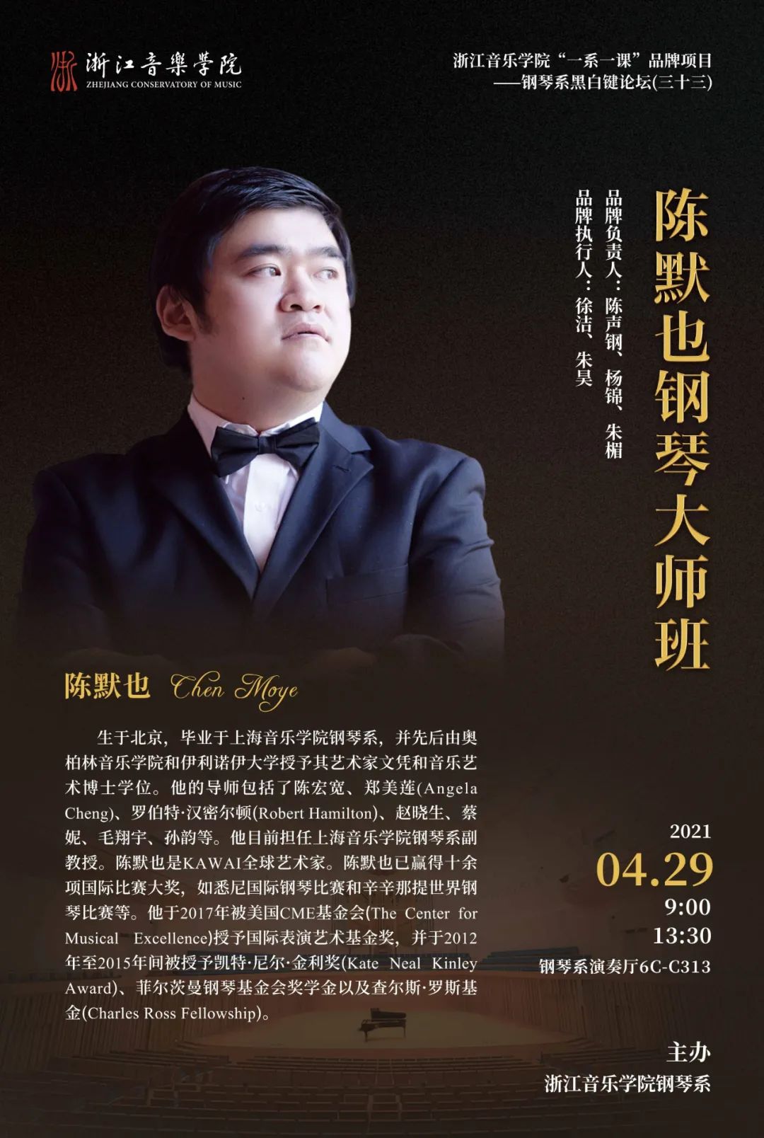 陈默也生于北京,毕业于上海音乐学院钢琴系,并先后由奥柏林音乐学院和伊利诺伊大学授予其艺术家文凭和音乐艺术博士学位。他的导师包括了陈宏宽、郑美莲(Angela Cheng)、罗伯特·汉密尔顿(Robert Hamilton)、赵晓生、蔡妮、毛翔宇、孙韵等。他目前担任上海音乐学院钢琴系副教授。