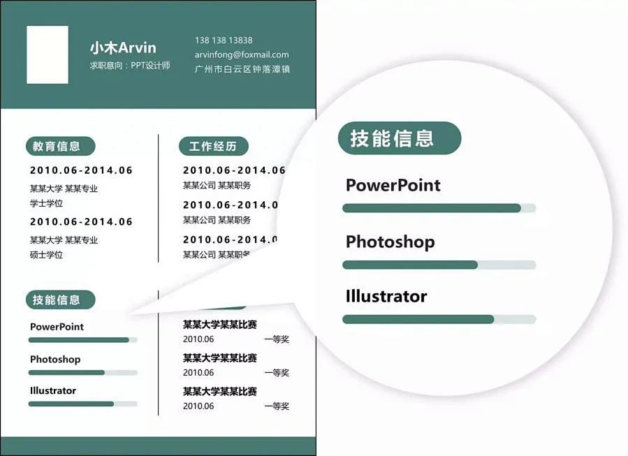 其他信息可以包括教育、技能、获奖。 如果你会多项技能,比如PS、AE,或者考过什么证书,你也可以把这些信息单独组成一个模块,同理,如果你曾经获得过什么重大奖项,你一样可以用单独一个模块列出来。